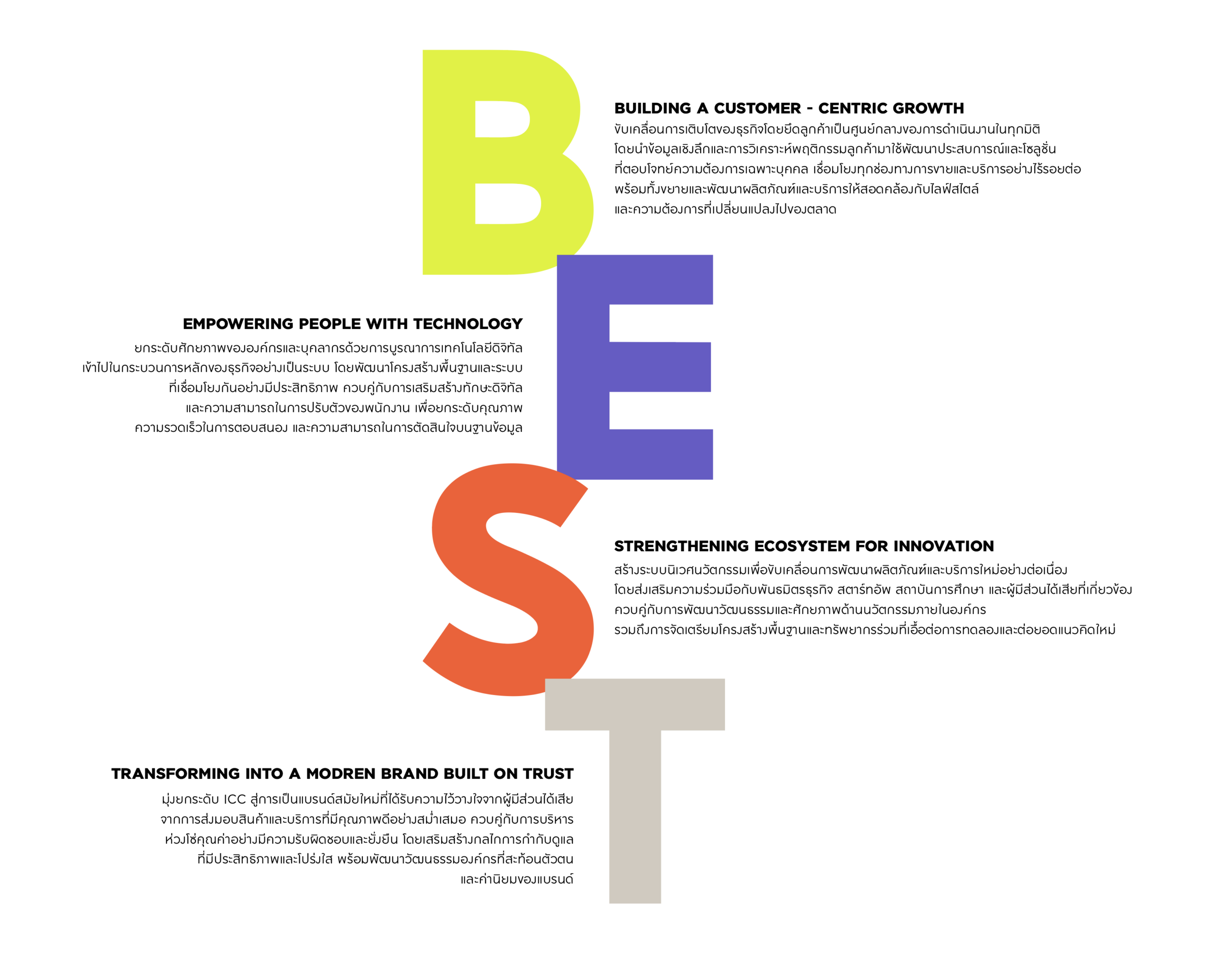 มุ่งยกระดับ ICC สู่การเป็นแบรนด์สมัยใหม่ที่ได้รับความไว้วางใจจากผู้มีส่วนได้เสีย จากการส่งมอบสินค้าและบริการที่มีคุณภาพดีอย่างสม่ำเสมอ ควบคู่กับการบริหารห่วงโซ่คุณค่าอย่างมีความรับผิดชอบและยั่งยืน โดยเสริมสร้างกลไกการกำกับดูแลที่มีประสิทธิภาพและโปร่งใส พร้อมพัฒนาวัฒนธรรมองค์กรที่สะท้อนตัวตนและค่านิยมของแบรนด์